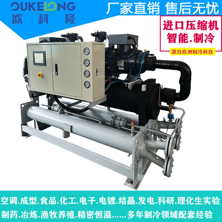 欧科隆制冷160HP双机头水冷螺杆式冷水机是一款高性能工业制冷设备,专为大型连续生产场景设计。该机型采用双螺杆压缩机并联技术,实现160匹(约470kW)制冷量输出,具备卓越的能效表现和运行可靠性。