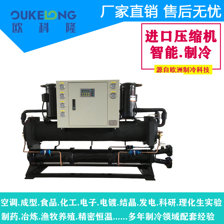 欧科隆牌水冷开放式冷水机组适用于化工、电镀、油墨、光纤、电子、医疗、工业设备冷却、热源冷却、混凝土搅拌站、制造桥梁、(制混凝土、制桥梁专用冷水机型,性能比普通冷水机型高出30%,可以定做移动式冷冻机组)等多种场合。