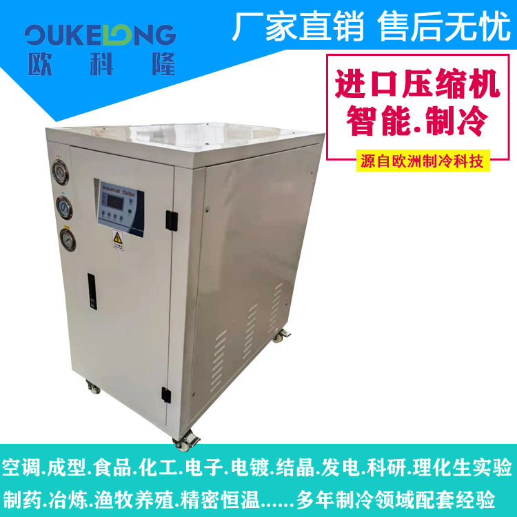 欧科隆制冷水冷箱式冷水机组详细特点介绍.制冷心脏采用全密封低噪音,振动小,采用高效能省电国际著名名牌压缩机(美国谷轮牌,日本三洋,日本大金,法国美优乐等),电器控制全部采用进口名牌原件,热交换器采用壳管式冷凝器,换热效能高,便于清洗保养。