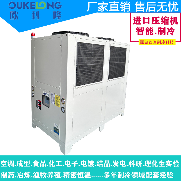 欧科隆20HP风冷箱式冷水机是一款大功率工业级制冷设备,专为中型生产环境和持续高负荷冷却需求设计。该机型采用一体化箱式结构,集成高效风冷散热系统,无需外接冷却塔,大幅降低安装复杂度与场地限制,特别适合水资源紧缺或通风条件良好的工业场景。