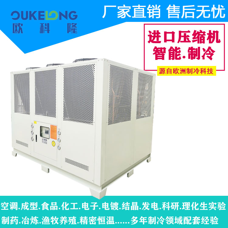 欧科隆牌风冷式冷水机之制冷心脏采用全密封低噪音,振动小,高效能省电进口名牌压缩机,电器控制全部采用进口名牌原件,热交换器采用壳管式冷凝器,换热效能高,便于清洗保养。4.采用高效率之螺纹钢管,两端盖可互换以交更接水管方向,水管流程多回路,各台冷凝器都与压缩机容量互相配合,直通式水管易清洗和维护保养。