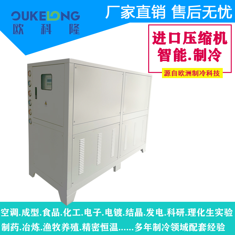 欧科隆牌螺杆式冷水机的冷凝器采用从外国原装进口的铜管,加工成梯形低助管,增强传热能力。铜管表面光滑,使水压降低,易清洗保养。