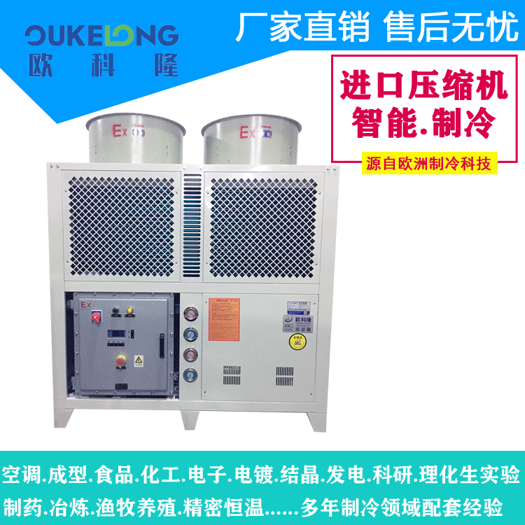 高效节能运行:采用防爆型涡旋压缩机,搭配高效壳管式换热器,能效比达4.2,较常规机型节能20%,支持-15℃~35℃宽温域调控。