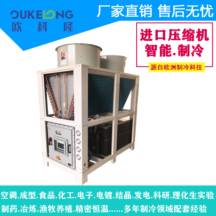 欧科隆20匹低温防爆冷水机以安全、稳定、高效为核心,适用于各类防爆环境,并提供定制化服务,满足不同工业需求。